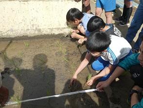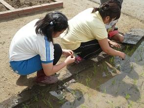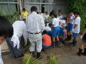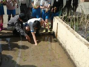 お話を聞いた後、一人一人が苗を田んぼに植えていきました。