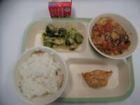 今日の給食は、ご飯、牛乳、ジャンボ餃子、中華サラダ、ジャージャン豆腐 でした。ごちそうさまでした。