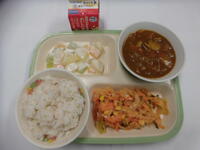 今日の給食は、麦入りご飯、牛乳、ダルカレー、カチュンバル(サラダ)、フルーツヨーグルト でした。ごちそうさまでした。栄養士さん、調理員さん、配膳員さん、後期もよろしくお願いいたします。