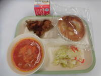 今日の給食は、りんごパン、牛乳、ミラノ風カツレツ、イタリアンサラダ、ミネストローネスープ でした。ごちそうさまでした。