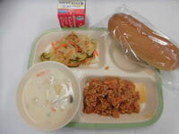 今日の給食は、スライスコッペパン、牛乳、ミートサンド、キャベツサラダ、クリームシチュー でした。ごちそうさまでした。