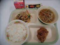 今日の給食は、ご飯、牛乳、鶏肉の唐揚げ、小松菜のおひたし、沢煮椀、韓国のり でした。ごちそうさまでした。