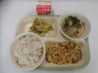 今日の給食は、麦入りご飯、牛乳、あぶたま丼の具、胡麻和え、きのことほうれん草の味噌汁 でした。ごちそうさまでした。