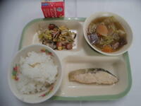 今日の給食は、ご飯、牛乳、サケの味噌マヨ焼き、チンゲンサイとウインナーのソテー、すいとん でした。ごちそうさまでした。