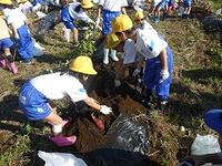 2年生がそれぞれめいめいに選んだ苗を持ってきてくれた張替園芸さんから苗をもらい、自分の植木鉢に土を入れ苗の植え方を教わりながらていねいに行いました。