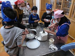 普段はガスコンロなどで簡単に火をつけることができますが,初めて使う火起こし器に子どもたちは苦労していました。大変だった分,火が付いた時の感動も大きかったようです。成功するたびに,歓声があがっていました。