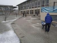 昨日の雪が校庭に積もっており、児童の安全確保のため朝から職員が雪かきをしました。