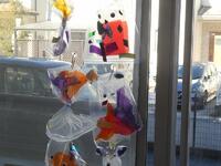 1年生の教室には、図画工作の『光の国のなかまたち』という題材の作品を飾っていました。