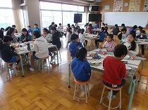 6年生各クラスが4グループに分かれ,校長先生と一緒に給食を食べています。