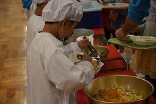 先生たちと一緒に,盛り付け方や一人一人の量について学んでいきます。