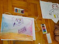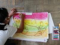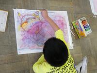 カラフルに色づけした紙に、クレヨンで少しずつ鬼を描いています。角や牙を丁寧に表現できました。