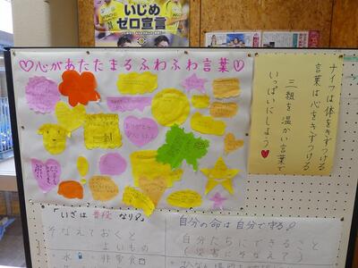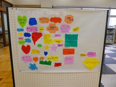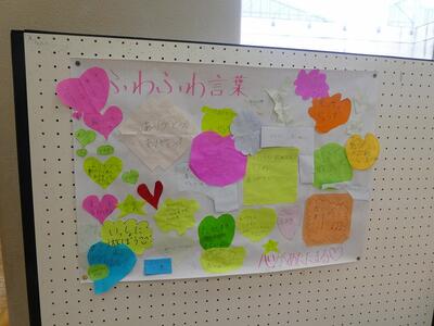 4年生廊下に、各クラスで道徳の時間に話し合って勉強した「ふわふわ言葉」が掲示されていました。