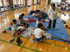 いきいきクラブの方にお手伝いをしてもらいながら、体育館で思い思いのかかしを作り上げました。