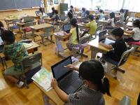 また、1年生の他のクラスでは夏休みの思い出をタッチペンを使って手書き入力でパソコンに向かっていました。