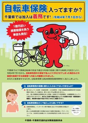 千葉県では、令和4年7月1日より、「千葉県自転車の安全で適正な利用の促進に関する条例」の改正により、千葉県内での自転車利用者等に対し、自転車利用中の事故で他人にケガをさせてしまった場合などの損害を賠償できる自転車保険等への加入が義務化されます。