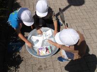 校庭へ行くと、1年生は何やら楽しそうな様子。生活科のおもちゃづくりで水遊びをしていました。紙パックを浮かべたり、マヨネーズの容器に水を入れて遠くまでぴゅーっ!と飛ばしたり。水が遠くに飛んでいくのが楽しいようで、校庭や空に向かってどんどん発射していました。時々かかる水しぶきに「きゃー」「冷たい~」と弾けた笑顔。夏休み目前に、楽しい思い出ができましたね。