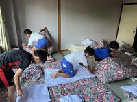 6時に起床後、寝具を畳み、散策の準備をしています。
