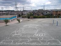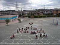 2階のベランダに登ってみると、なんと!奈良の東大寺の大仏が校庭に描かれていました。社会科の学習で習った奈良の大仏の大きさを体験するために、実際の大きさを測って白線を引いていたようです。35人の児童が全員入ってしまうくらい、大きいのですね!こうやって体感することで、興味をもってくれると嬉しいですね!