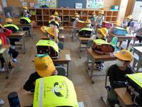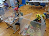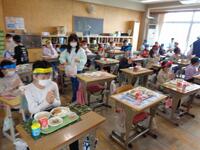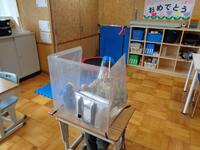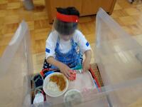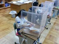 先日のホームページの記事でお伝えしたとおり、長期休業明けであることから、給食時のフェイスシールドの着用をお願いしています。保健所の指導も踏まえ、濃厚接触者になってしまうことを防止するために行っています。