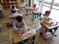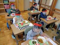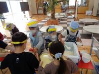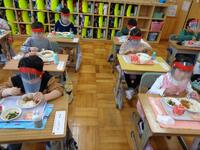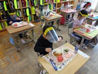 まん延防止等重点措置の期間中ではありませんが、長期休業明けですので、フェイスシールドをつけての給食です。