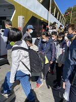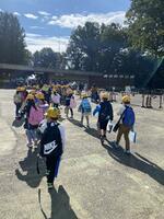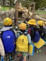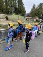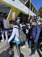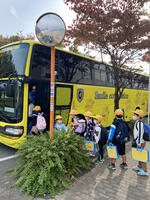 行ってきまーす!元気に挨拶して、1年生がバスに向かいます。