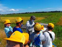 子どもたちは双眼鏡やビニール袋を手に、ワクワクしながら田んぼへと向かいました。