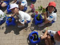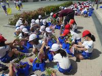 2年生がそれぞれめいめいに選んだ苗を持ってきてくれた張替園芸さんから苗をもらい、自分の植木鉢に土を入れ苗の植え方を教わりながらていねいに行いました。