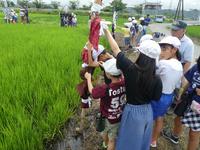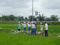 田植えを行った水田までかかしをトラックで運んでもらい、水田を囲むように立てる穴を掘っていただきました。