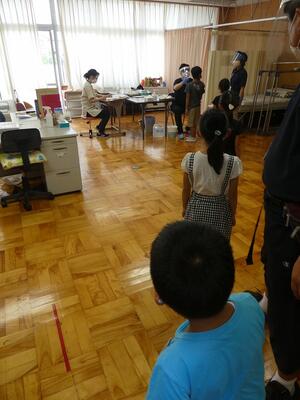 検診会場では、学校医の先生を始めとして、検温やサポートの職員フェイスシールドを着用します。