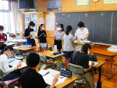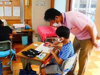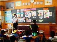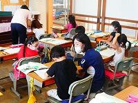 早速1年生と一緒に、国語の学習を行いました。ノートのとり方について、一人一人に丁寧にアドバイスをしてくれました。