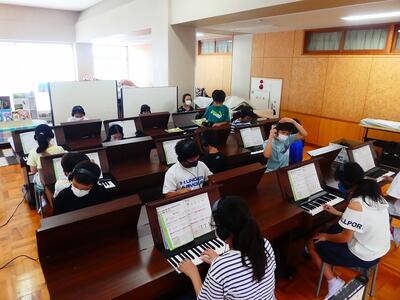 音楽室の前では、5年2組がオルガンを使った勉強していました。
