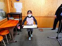 代わりに、今日までに1~5年生みんなで準備したプレゼントを代表児童が、6年生に渡しました。