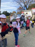 たくさんの秋を見つけたね。1年生は、秋のお土産を持って、嬉しそうに笑顔で学校へ帰ってきました。