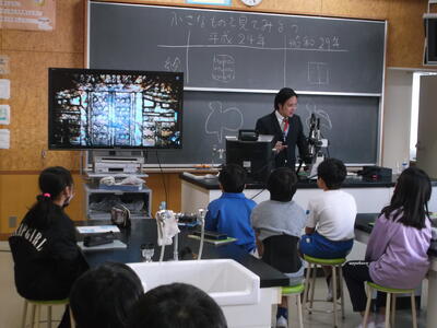 また、各班で身の周りで顕微鏡を使って見たいものを決め、実際に観察を行いました。拡大してみると、いつもと違った様子に4年生も目を輝かせていました。ご来校いただいた野島先生、学生の皆さん、ありがとうございました。