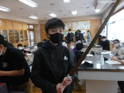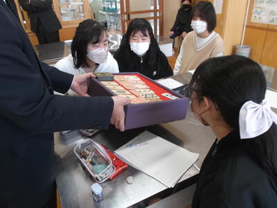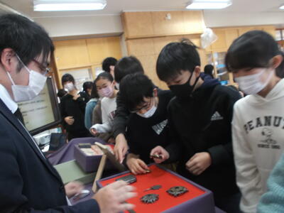 2組、3組が学級閉鎖のため、1組のみの実施になりましたが、2、3組の児童はオンラインでの学習となりました。鈴木貫太郎がどんな人物だったのか写真や記録をもとに学びました。鈴木貫太郎の実際に使っていたトランプや刀、身につけていた勲章に触れたり、貫太郎の実寸大の大きさを感じました。