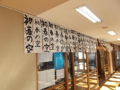 現在、校内書き初め大会で取り組んだ作品が展示されています。今日は1.2年生の硬筆の作品を紹介します。