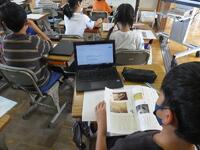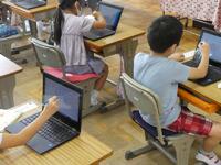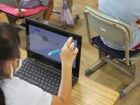 また、1年生の他のクラスでは夏休みの思い出をタッチペンを使って手書き入力でパソコンに向かっていました。