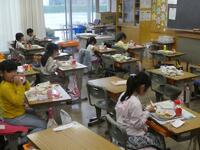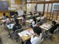 緊急事態宣言は解除されましたが、学校では引き続き感染症対策をしています。給食の時間は前を向いて黙食です。皆さん行儀良く食べていました。今日の給食は豆がたくさん入ったハヤシライスにチーズの入ったキャベツサラダに黄桃ヨーグルトに牛乳でした。