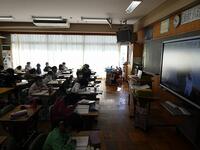 学校にある電子黒板を活用して、密にならないよう3学級同時進行で行いました。