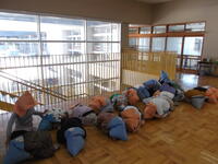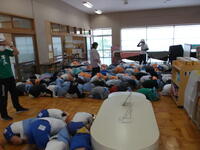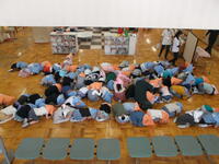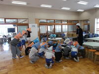 今回はJアラート対応の避難訓練です。警報が鳴った後、防災頭巾をかぶって頭を守る行動をとりました。