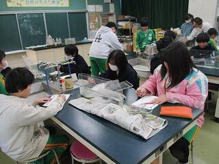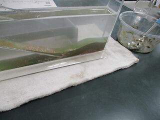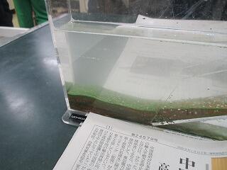 6年1組 理科「地層」地層のでき方について実際に実験で確かめる活動に取り組んでいました。「泥」「砂」「れき」が混ざったものを何回か水で流し、地層のでき方を確認することができました。