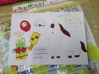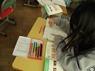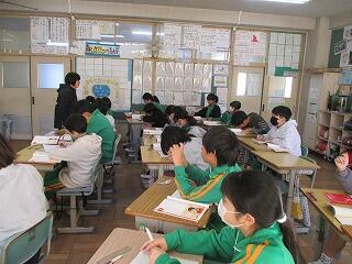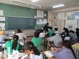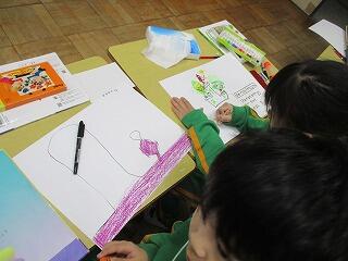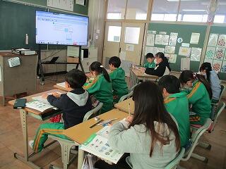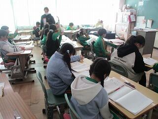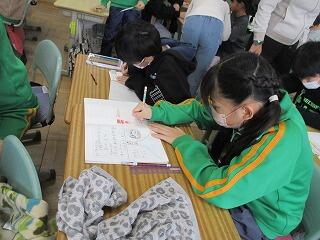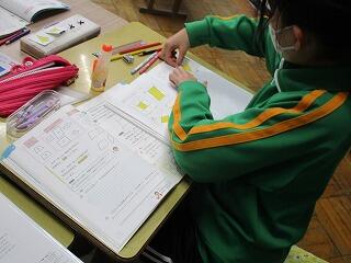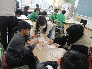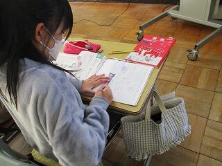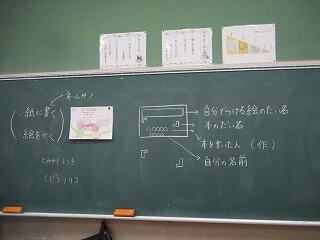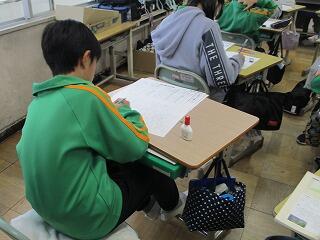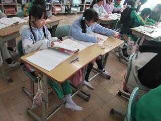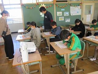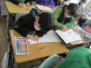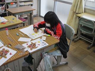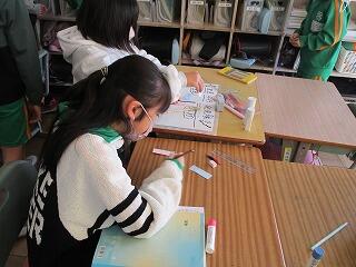 4年1組 国語「葉書」葉書の書き方の学習です。新年に向け、お世話になった人に「年賀状」を出していきます。郵便番号や宛名を書いたり、表紙に絵を描いたりして、受け取った人のことを考えながら作品作りを進めていました。