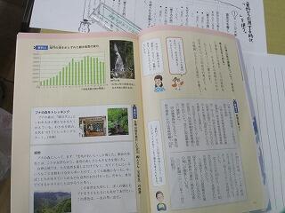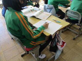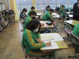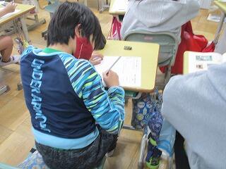 5年1組 国語「白神山地」今まで学習したことを取り入れながら意見文を書く学習です。「意見」「根拠」がきちんと書かれているか、参考例の文章を確認しながら文章作りに取り組んでいました。