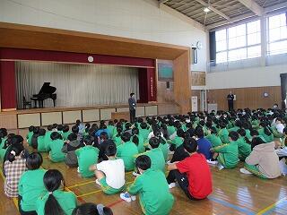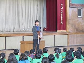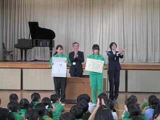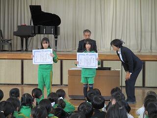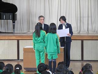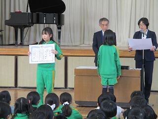 次にあおいそら運動の「実践文」「善行賞」の表彰を行いました。「あいさつ」や「おもいやり」等のテーマで作文を書いた児童と、朝の挨拶運動に取り組んだ「児童会」「生活委員会」が表彰されました。あおいそら運動がさらに広まってほしいと思います。