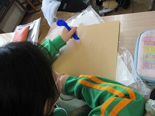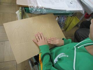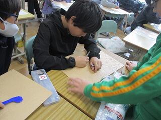 6年1組 図工「版画」版画版を掘ったり、突っついたりしてへこみをつけ、版画作品を作成する学習です。下絵をもとにへらや鉛筆をつって原版を作っていました。
