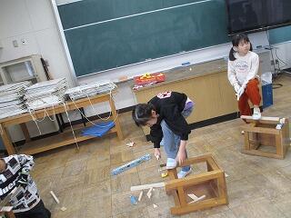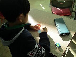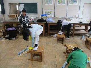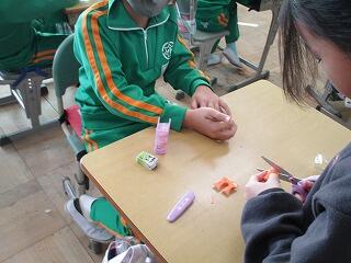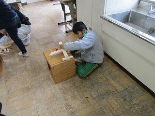 3年1組 図工「木工作」木材を切ったり、くっつけたりして作品を作る学習です。何時間か学習してきたので、のこぎりの使い方も上手になってきています。切り取った木片は、木工用ボンドを使って貼り合わせていきます。