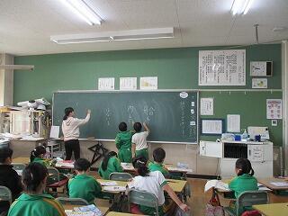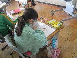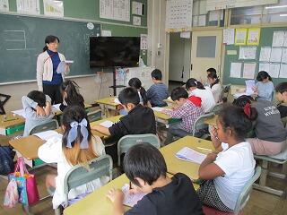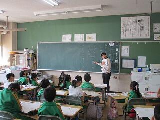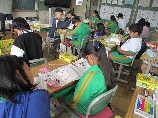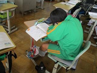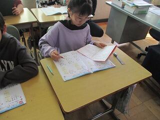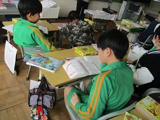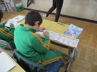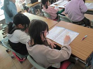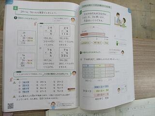 3年1組 算数「かけ算」2桁×1桁の繰り上がりのある筆算の学習に取り組んでいました。10の位に繰り上がった数をどのようにするのか、教科書を見ながら確認して理解していました。今日は西武台高校の生徒さん2名がボランティアとして、子どもたちの学習のお手伝いをしに来ていただいています。