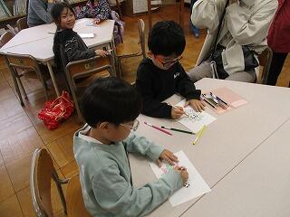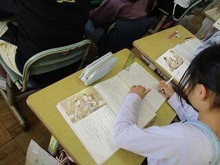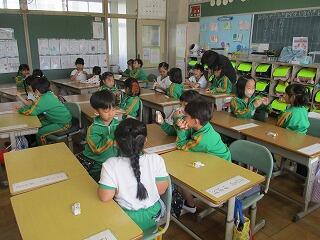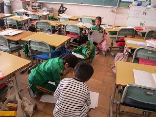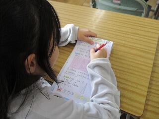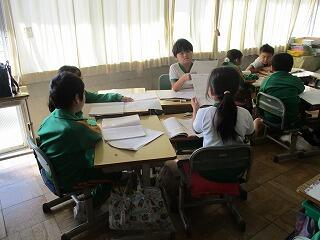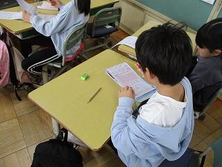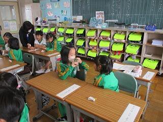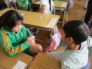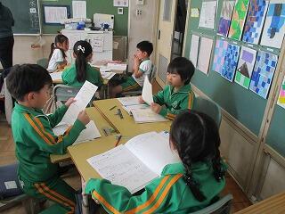 2年1組 国語「おもしろいもの見つけたよ」校庭や七小山で友達に教えたくなるような面白いものを見つけたことを友達に紹介する学習です。今日は本番の発表に向け、出来上がった作文を友達に紹介し確認する活動に取り組んでいました。