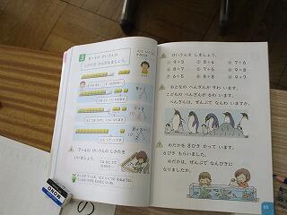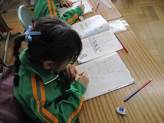 1年1組 算数「たし算」繰り上がりのあるたし算の学習に取り組んでいました。たす数を10の束になるように分け、残りの数を足して答えを求めていきます。子どもたちはやり方を覚えた後、多くの問題を意欲的に解いていました。