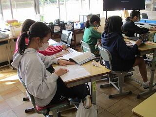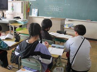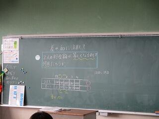 5年1組 算数「差と和に注目して」変化する2つの数量とその和や差に着目し、表に書き表し変化の規則を見いだしながら問題を解いていく学習です。 わからないところは先生や友達に教えてもらいながら課題を解決していました。